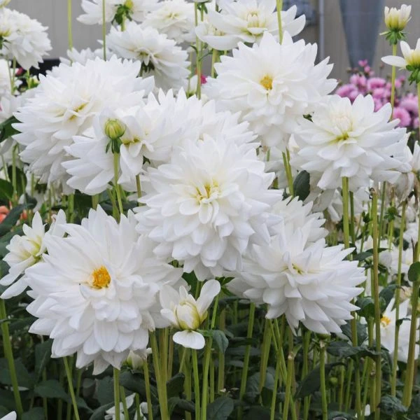 The flat, upfacing white flowers of Dahlia ‘Eternal Snow,’ deftly touched with yellow at their centers, reflect the cool serenity of autumn’s full moon. Their 5″ size is just right for vases as well as borders. Decorative form.
