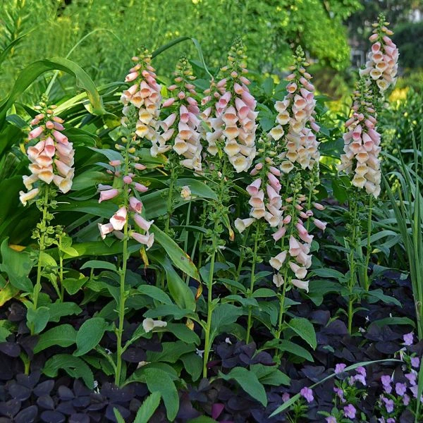 Digitalis purpurea ‘Dalmatian Peach’ blossoms are creamy peach infused with pink and freckled at the throat, and change to pale peach as the season progresses. These robust plants grow quickly, and they’ll flower in their first season.
