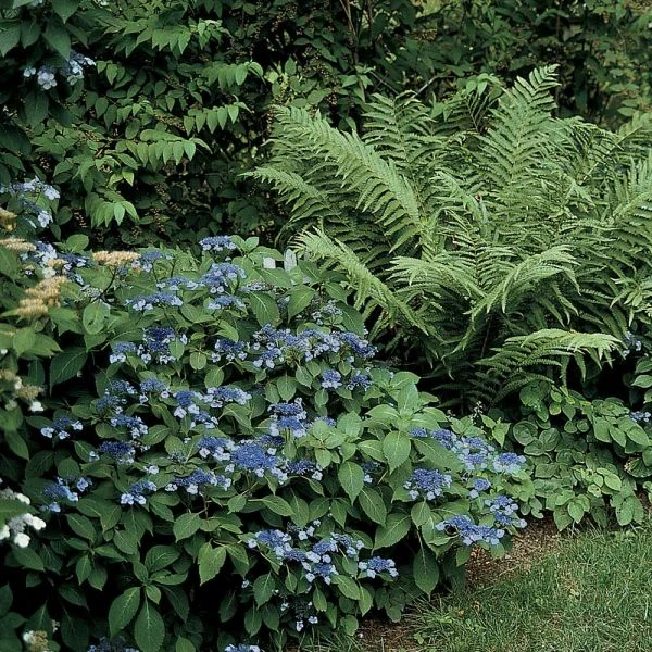 The parents of this lovely Hydrangea serrata (Lacecap) variety were found growing on the wooded slope of a Korean mountain, which explains Blue Billow’s exceptional hardiness. This shrub produces delicate clusters of light blue flowers that last for several weeks in early to midsummer (July here in Connecticut), turning a stunning deep crimson as they age. Fall foliage is an attractive shade of burgundy. Excellent in a shady border with Ferns and Astilbes. ‘Blue Billow’ is a reliable bloomer through Zone 6, and adventurous gardeners in Zone 5, where flowering occurs 3 or 4 years out of 5 may also wish to give it a try. It performed well at our nursery in full sun. Blooms on old wood.