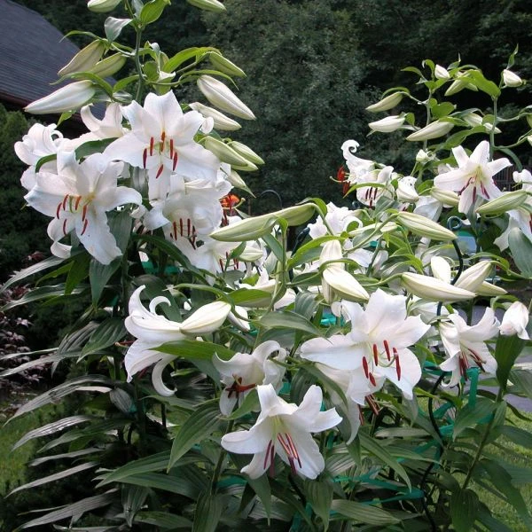 Even in a group of bulbs noted for yielding large flowers, vigorous growth, and sweet perfume, Lilium ‘Casa Blanca’ is a standout. The huge flowers are pure, gleaming white, delicately flocked in a way that adds richness and texture. When this Lily blooms in our Moon Garden, our staff find excuses to wander nearby, while visitors stand transfixed, lost in the perfume and admiring the hawkmoths that hover over the blooms day and evening. Adjectives like “astonishing” and “ravishing” may seem like catalog hyperbole, until you actually see one of these Lilies in bloom. Then words fail. ‘Casa Blanca’ is widely regarded by horticultural professionals as the best white Oriental Lily ever.