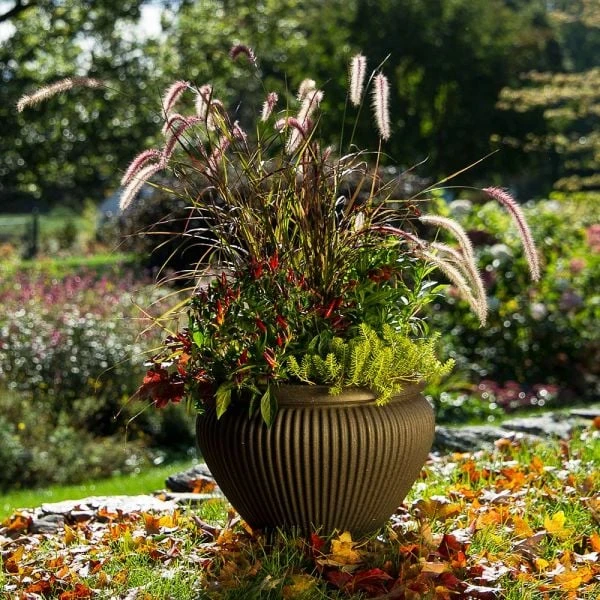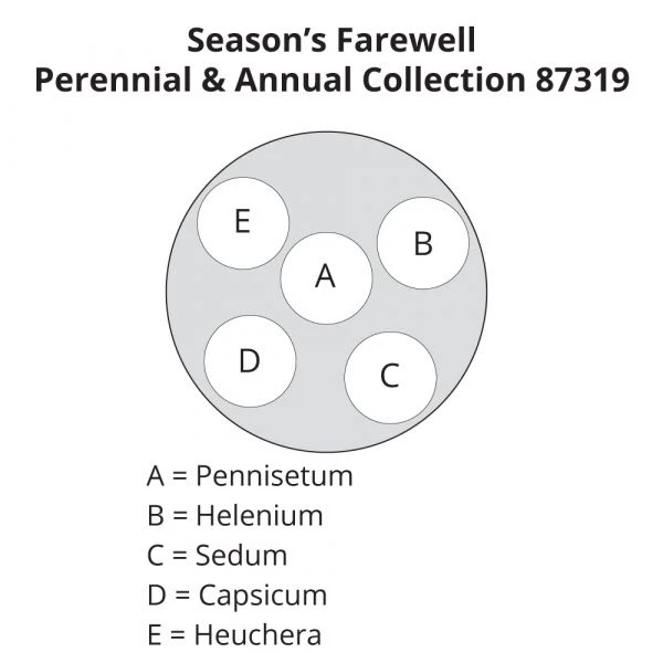 The billowing inflorescences of Pennisetum ‘Rubrum’ wave goodbye to summer above a collection of glorious colors that signal the start of fall. Ornamental Pepper ‘Medusa’ sends up flares of yellow, orange and red, their hues echoed in the spicy blossoms of fall favorite Helenium Mariachi™ ‘Fuego,’ and the changing foliage of Heuchera ‘Peach Flambe.’ Spiky shoots of Sedum ‘Angelina’ add a lively pop of color to remind us of summer’s heat. Complete care instructions included. 1 of each variety, 5 plants total. Container not included.