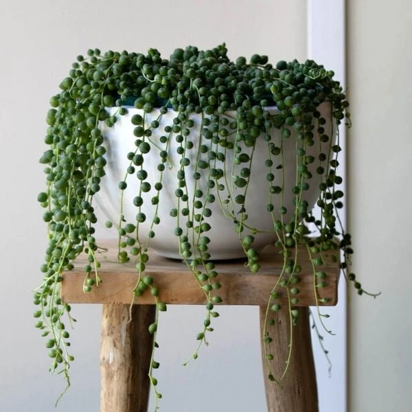 Senecio String of Pearls is native to South Africa where it grows as a ground cover in rocky, shaded areas, this diminutive succulent has more recently become the darling of photographers, and you can see why. Plants produce foliage in a form that mimics a string of pearls, each bead-shaped leaf adding to a cascading chain. Site this low-maintenance plant on a bookshelf or dresser in partial sun or bright indirect light, and it will send its tendrils tumbling over the edge. Shipped in an 8″ wide x 5″ tall white bowl.