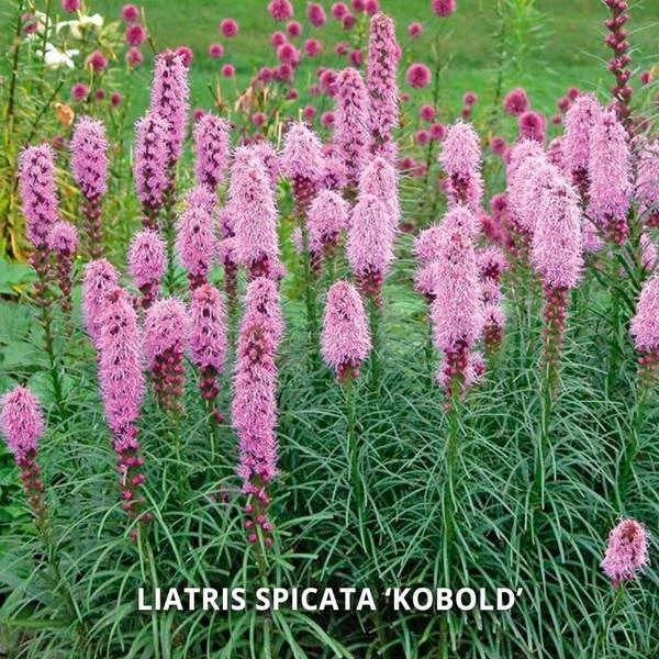 Butterfly favorite Liatris spicata ‘Kobold’ is a border standout for its distinctive form and color. These carefree native plants, also called Blazing Stars, produce upright purple wands that provide food for pollinators and a vertical accent in the garden.